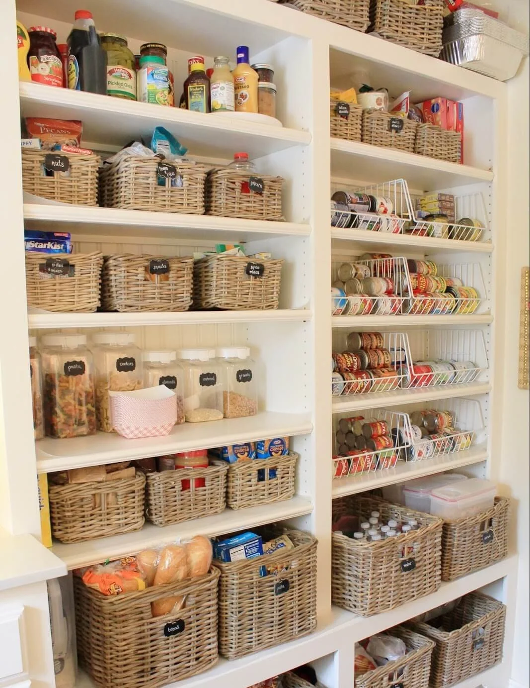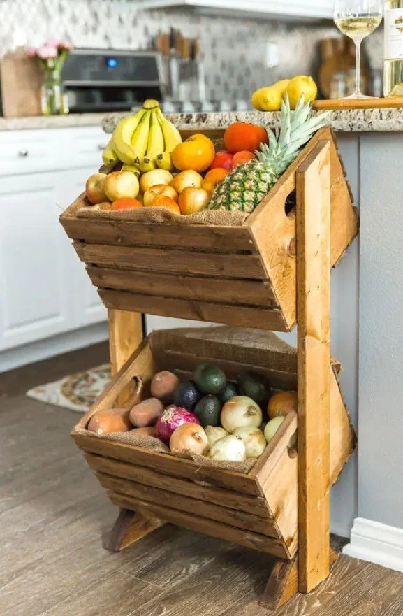 Wooden crates, wine boxes, or sturdy cardboard boxes can be used to organize bulk items like bags of flour, canned goods, or baking supplies. Stack them on lower shelves or in a pantry to group similar items together. They can also be painted or lined with fabric for a more polished appearance.