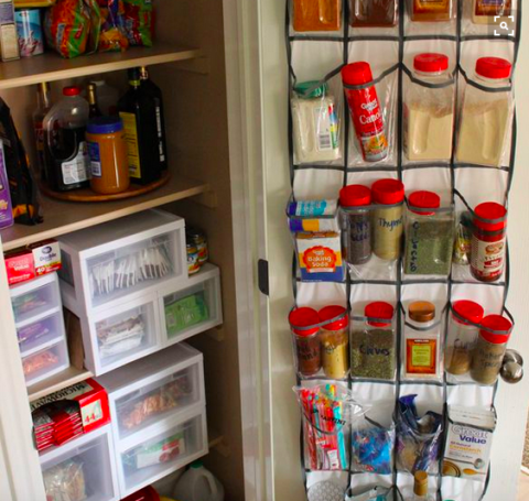 Over-the-door shoe organizers with clear pockets can be surprisingly useful in a kitchen. Hang one on the inside of your pantry door to store snacks, spice packets, small bottles, or even cleaning supplies. Each pocket acts as a mini shelf, giving you easy access to smaller items that often get lost in the shuffle.