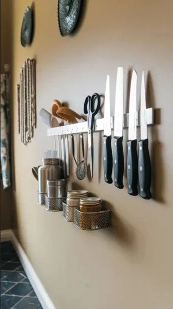Magnetic strips, often used for knives, can also hold metal spice tins, scissors, or even small utensils. Repurposing magnetic boards or strips from office supplies can give your kitchen walls a whole new purpose, keeping items off your countertops while remaining accessible.